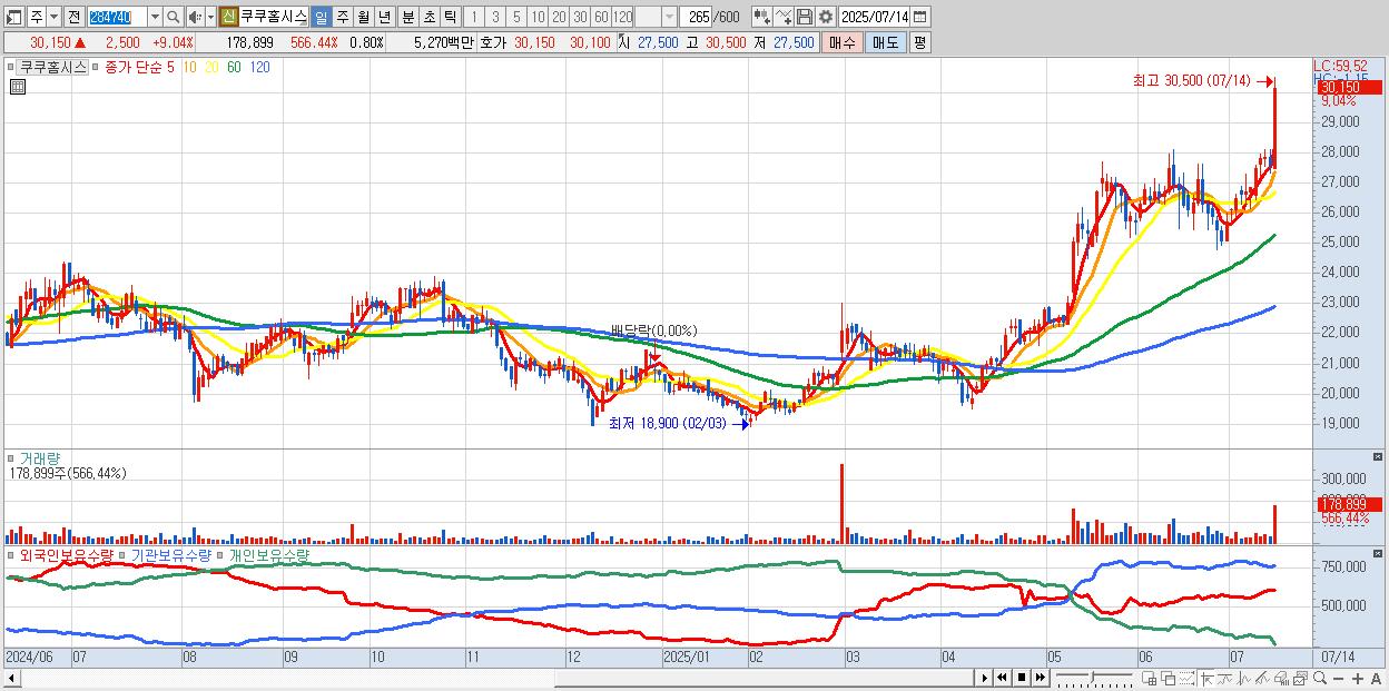 - 쿠쿠홈시스 (30,150원 ▲ 9.04% , 시총: 6,765억, 거래량: 178,899, 거래대금:53억, KOSPI)