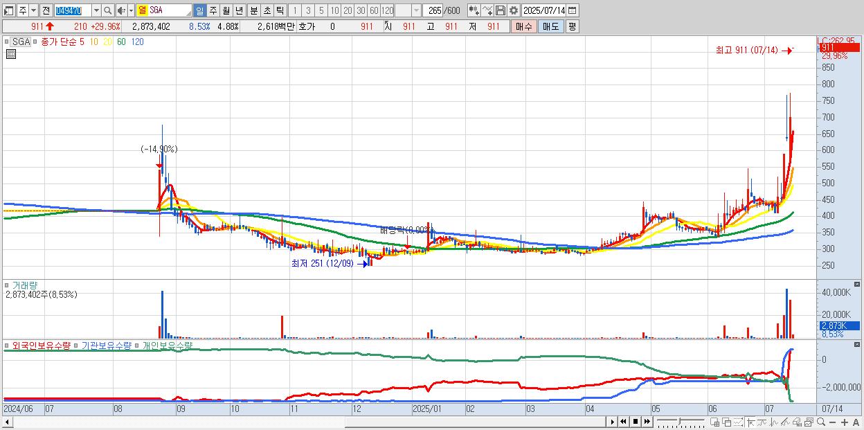 - SGA (911원 ▲ 29.96% , 시총: 536억, 거래량: 2,873,402, 거래대금:26억, KOSDAQ)