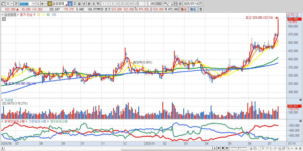 - 삼성화재 (518,000원 ▲ 9.51% , 시총: 238,338억, 거래량: 169,547, 거래대금:872억, KOSPI)