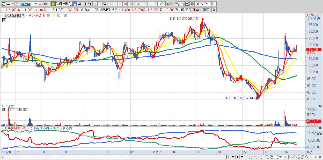 - SK이노베이션 (116,000원 ▲ 0.43% , 시총: 175,200억, 외국인 순매수 거래금:97억)