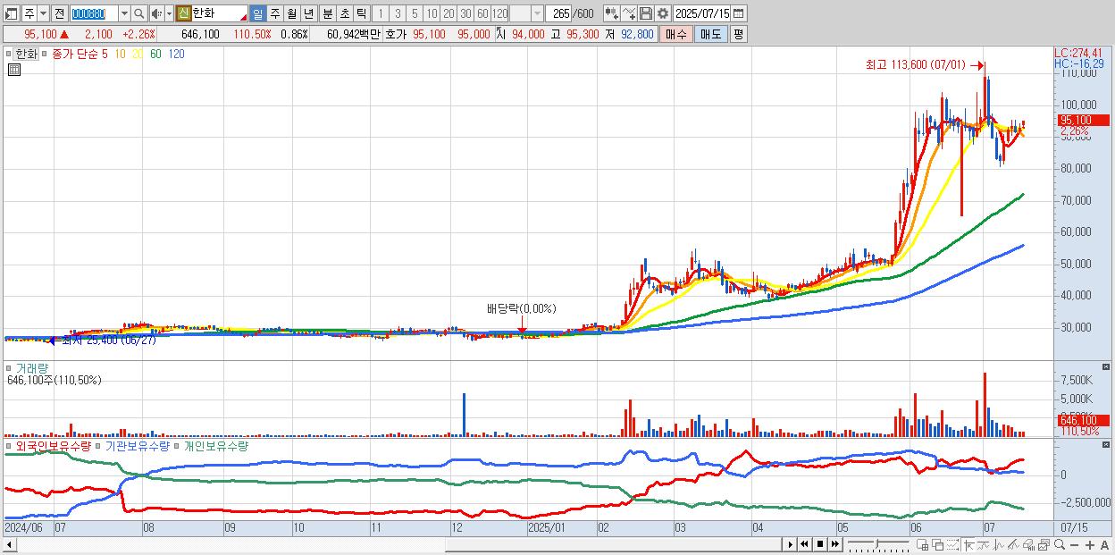 - 한화 (94,800원 ▲ 1.94% , 시총: 71,061억, 외국인 순매수 거래금:72억)