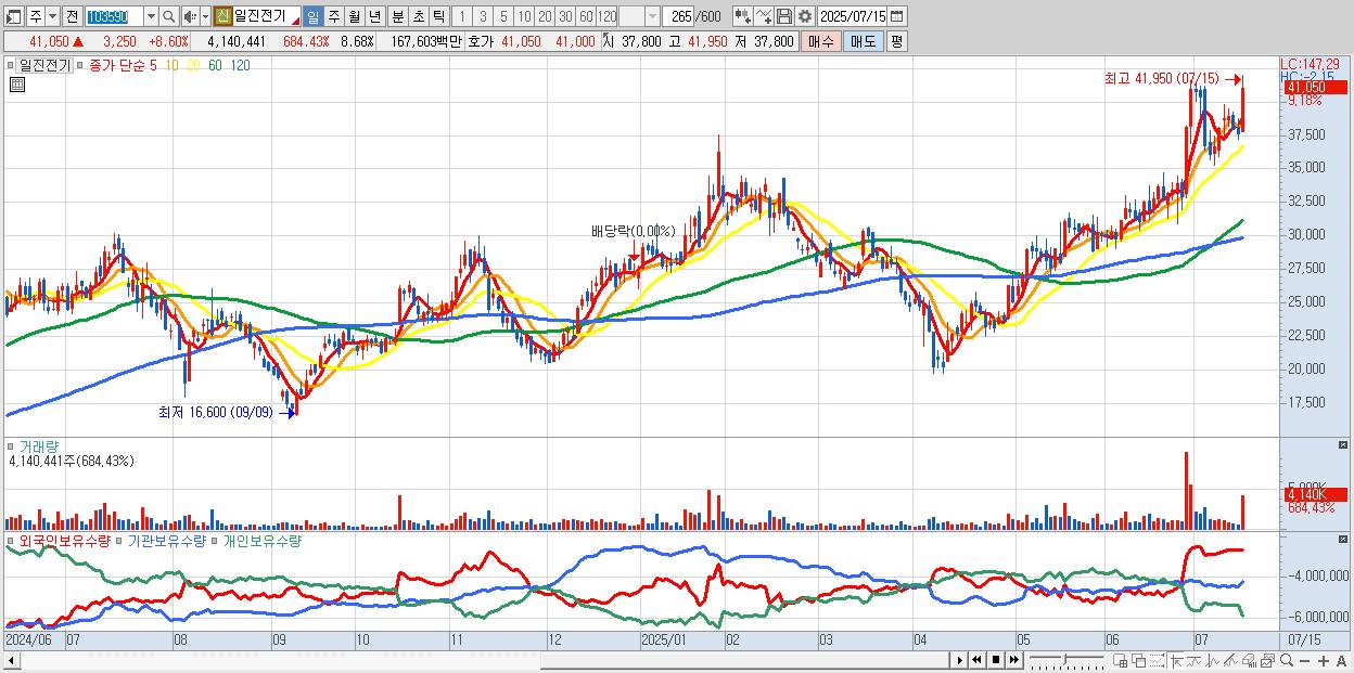 - 일진전기 (41,050원 ▲ 8.6% , 시총: 19,575억, 외국인 순매수 거래금:134억)