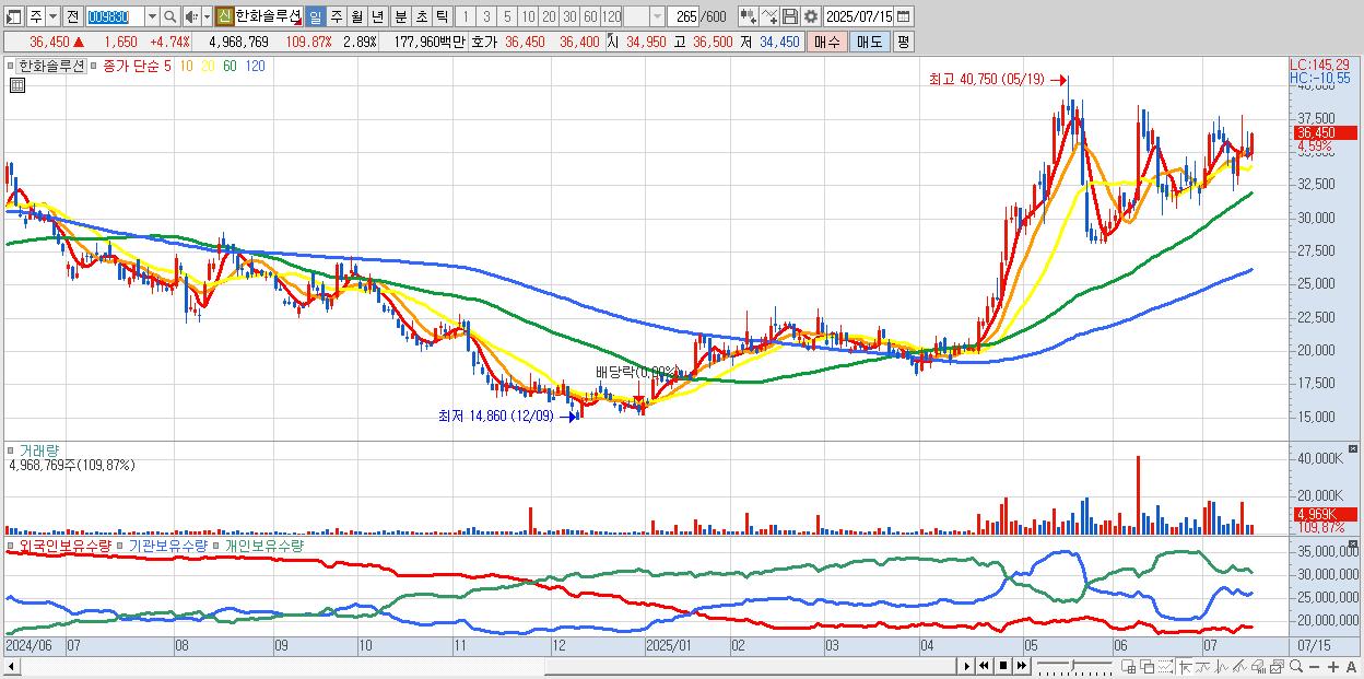- 한화솔루션 (36,200원 ▲ 4.02% , 시총: 62,225억, 외국인 순매수 거래금:203억)