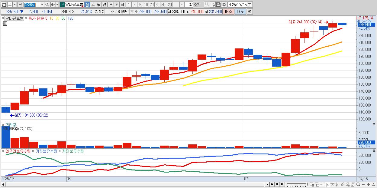 - 달바글로벌 (233,500원 ▼ -1.89% , 시총: 28,256억, 외국인 순매수 거래금:100억)