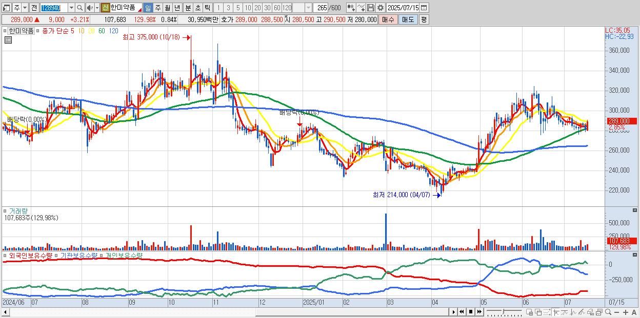 - 한미약품 (289,000원 ▲ 3.21% , 시총: 37,024억, 외국인 순매수 거래금:89억)
