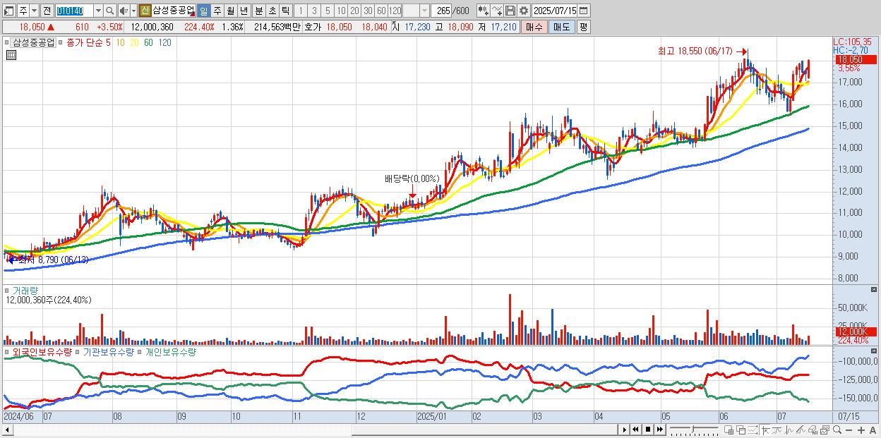 - 삼성중공업 (18,040원 ▲ 3.44% , 시총: 158,752억, 거래량: 7,887,623, 거래대금:1,411억)