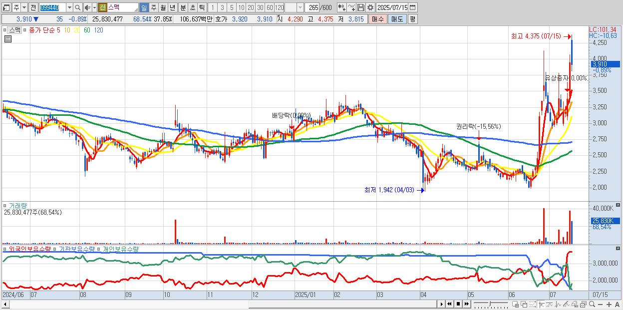 - 스맥 (3,910원 ▼ -0.89% , 시총: 2,668억, 거래량: 25,830,477, 거래대금:1,066억)