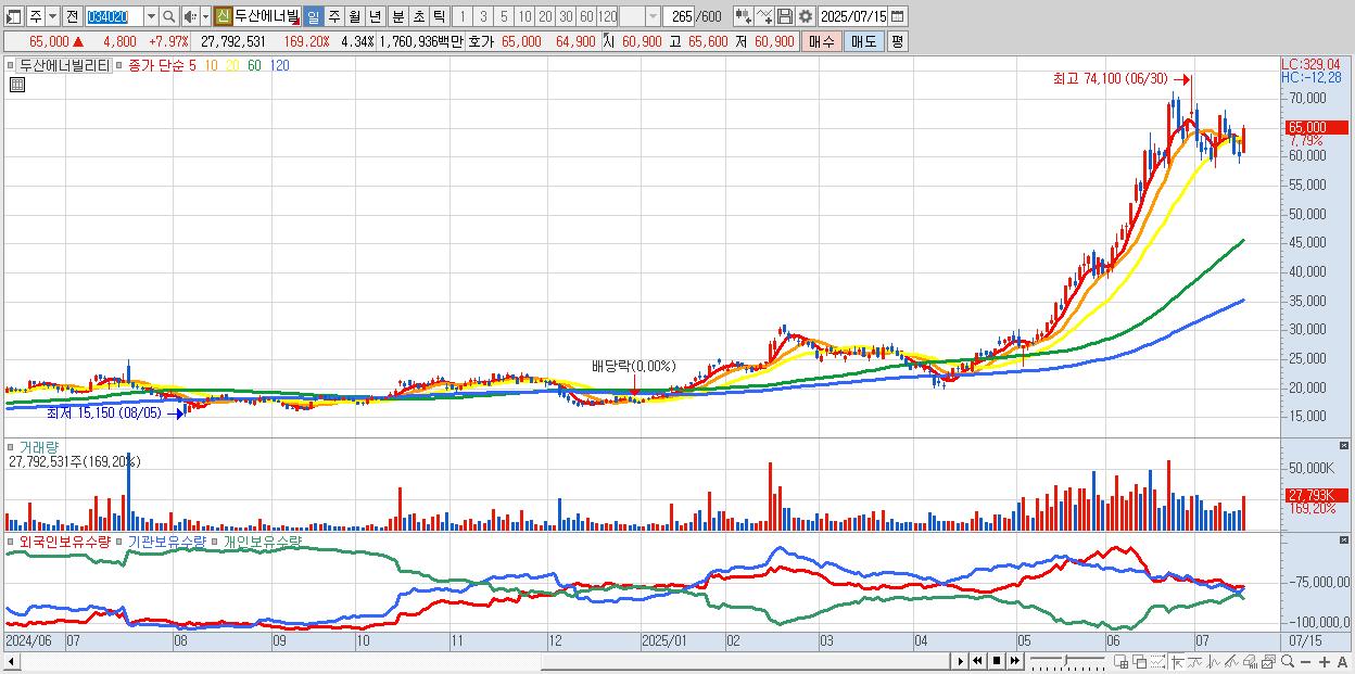 - 두산에너빌리티 (65,300원 ▲ 8.47% , 시총: 418,286억, 거래량: 12,238,170, 거래대금:7,756억)