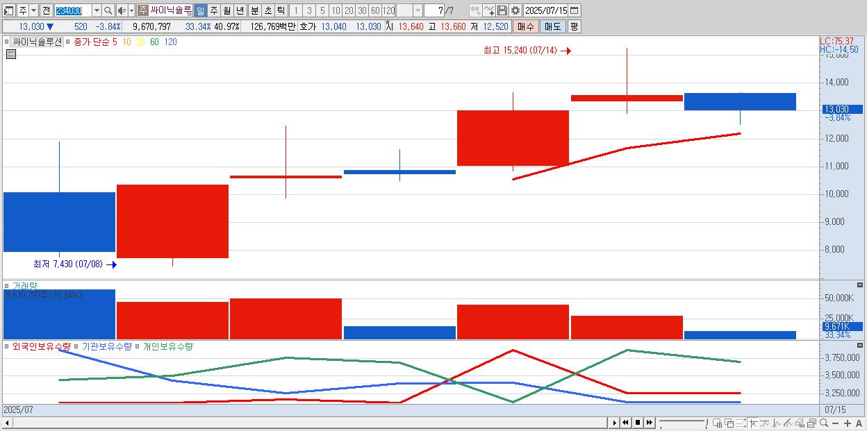 - 싸이닉솔루션 (13,030원 ▼ -3.84% , 시총: 3,076억, 거래량: 9,670,797, 거래대금:1,268억)