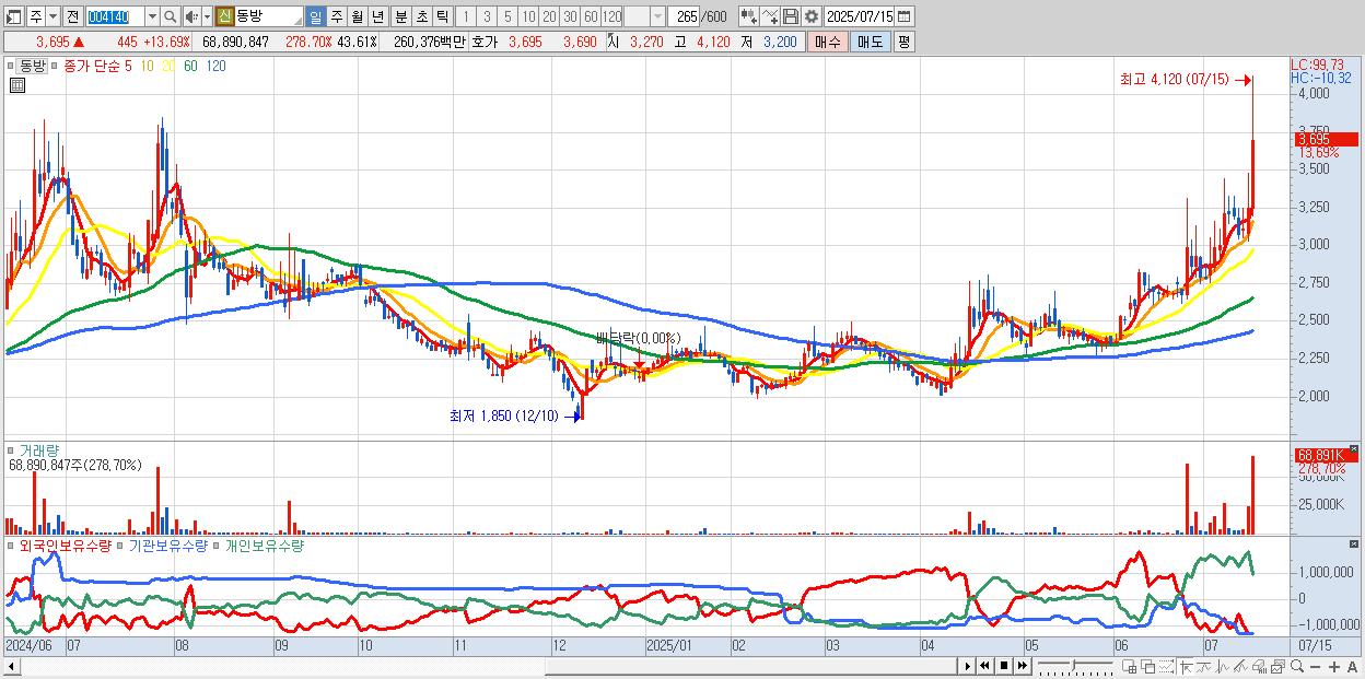 - 동방 (3,695원 ▲ 13.69% , 시총: 1,773억, 거래량: 68,890,847, 거래대금:2,604억)