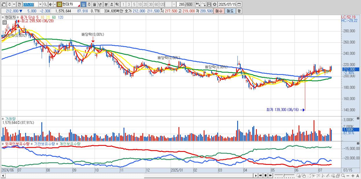 - 현대차 (211,000원 ▼ -2.76% , 시총: 432,039억, 거래량: 1,111,748, 거래대금:2,353억)
