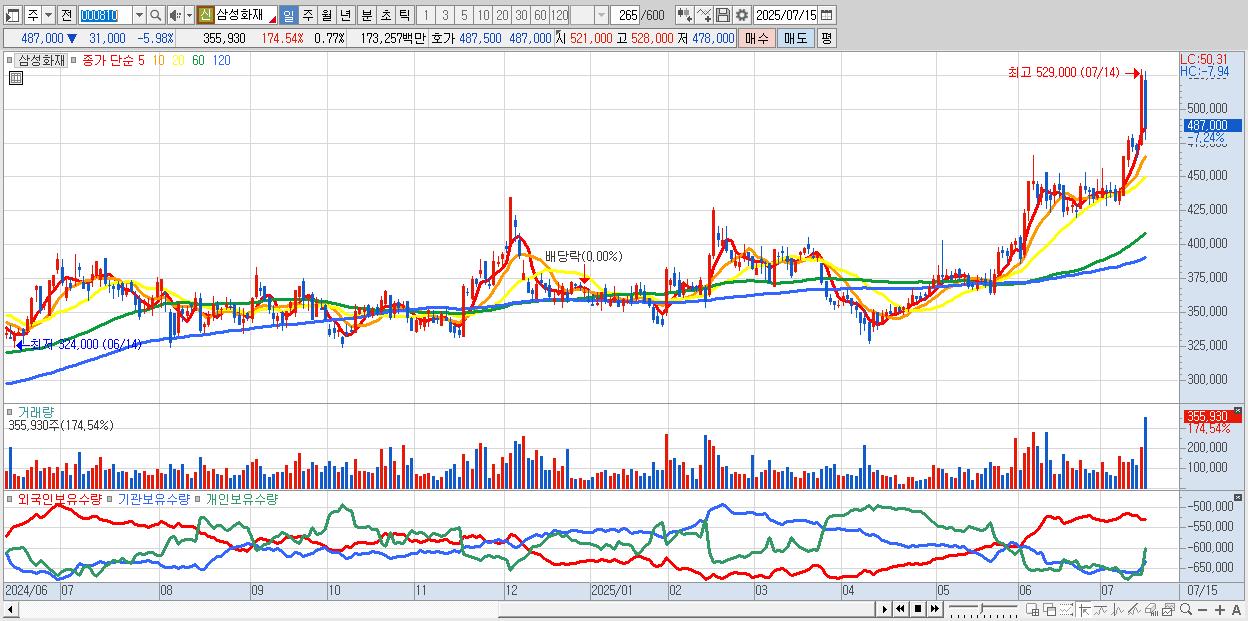 - 삼성화재 (485,500원 ▼ -6.27% , 시총: 223,384억, 거래량: 316,382, 거래대금:1,539억)
