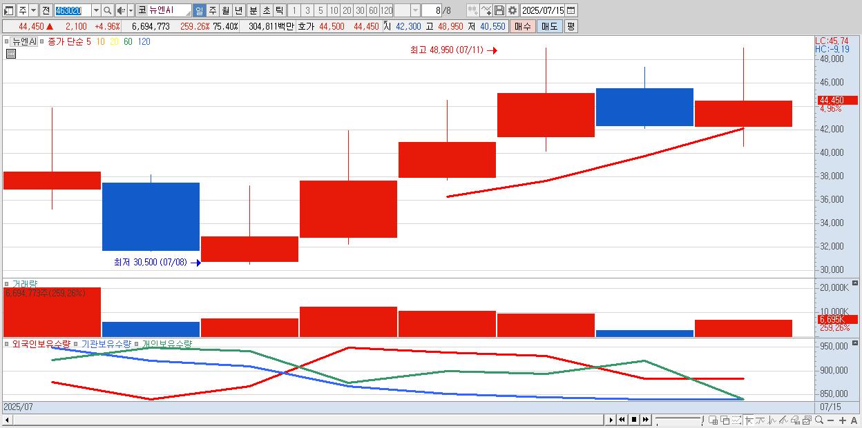 - 뉴엔AI (44,450원 ▲ 4.96% , 시총: 3,947억, 거래량: 6,694,773, 거래대금:3,048억)