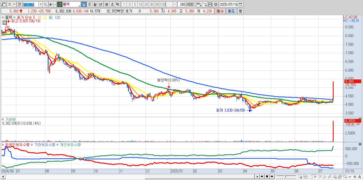 - 톱텍 (5,360원 ▲ 29.78% , 시총: 2,038억, 거래량: 6,302,036, 거래대금:330억)
