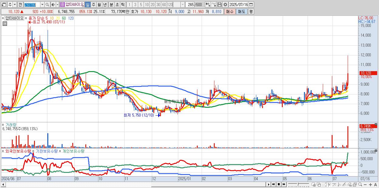 - 압타바이오 (10,120원 ▲ 10% , 시총: 2,720억, 거래량: 6,748,755, 거래대금:732억)