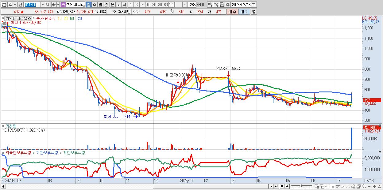 - 성안머티리얼스 (497원 ▲ 12.44% , 시총: 773억, 거래량: 42,139,548, 거래대금:223억)