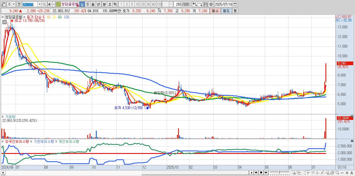 - 청담글로벌 (9,110원 ▲ 27.41% , 시총: 1,918억, 거래량: 8,643,125, 거래대금:764억)