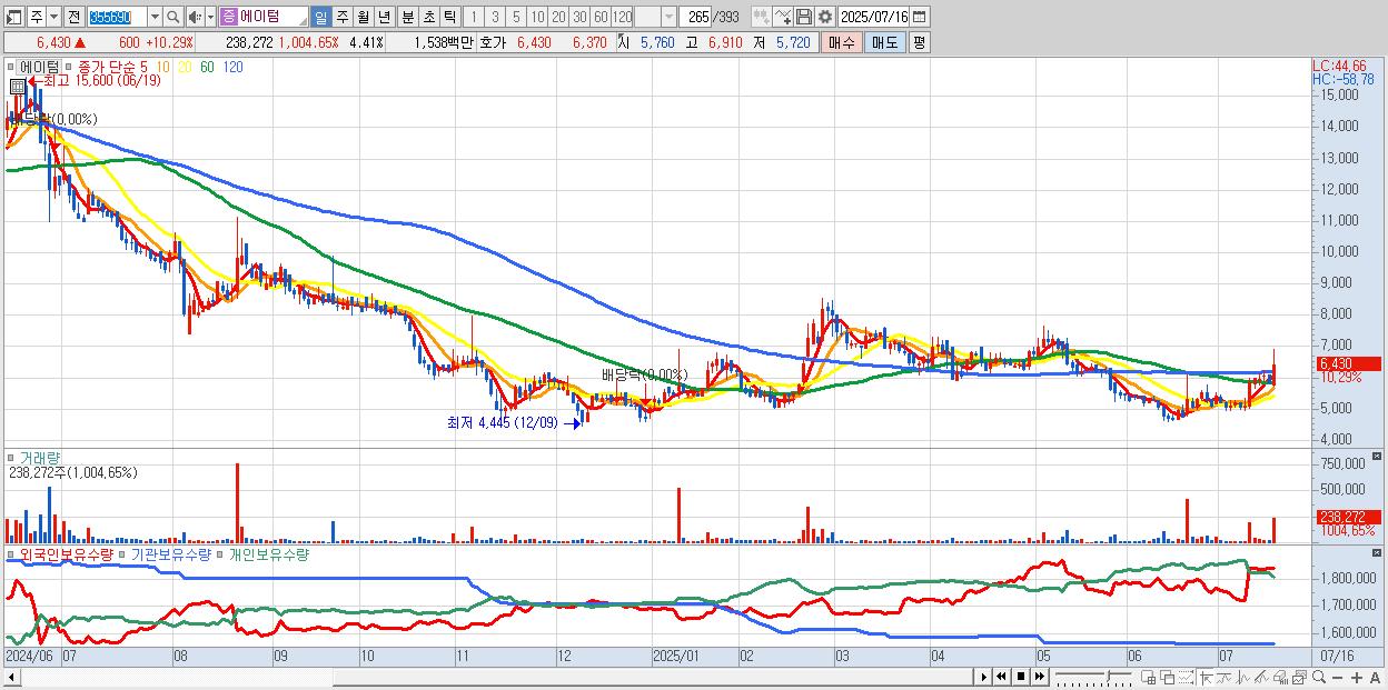 - 에이텀 (6,430원 ▲ 10.29% , 시총: 348억, 거래량: 238,272, 거래대금:15억)