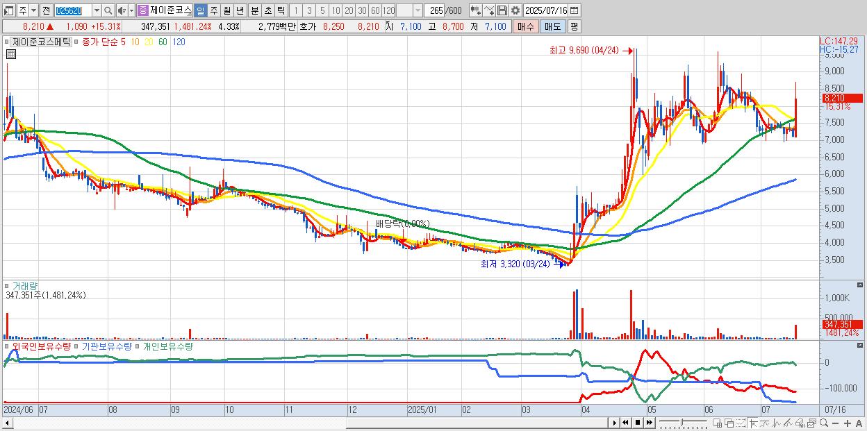 - 제이준코스메틱 (8,210원 ▲ 15.31% , 시총: 659억, 거래량: 347,351, 거래대금:28억)