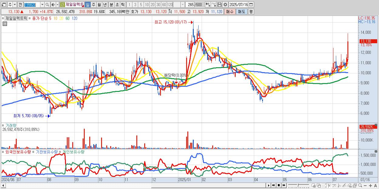 - 제일일렉트릭 (13,250원 ▲ 15.92% , 시총: 2,944억, 거래량: 13,995,014, 거래대금:1,818억)