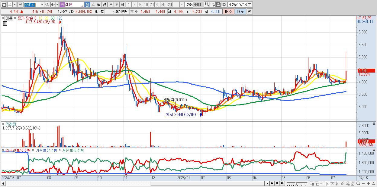 - 레몬 (4,450원 ▲ 10.29% , 시총: 935억, 거래량: 1,897,712, 거래대금:89억)