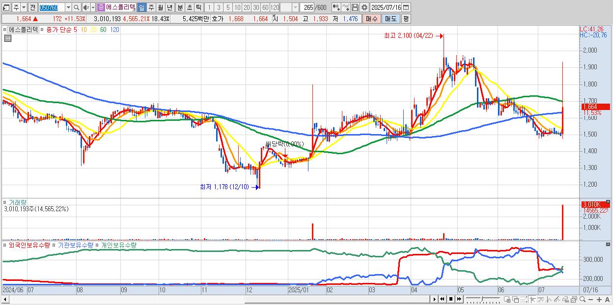 - 에스폴리텍 (1,664원 ▲ 11.53% , 시총: 272억, 거래량: 3,010,193, 거래대금:54억)