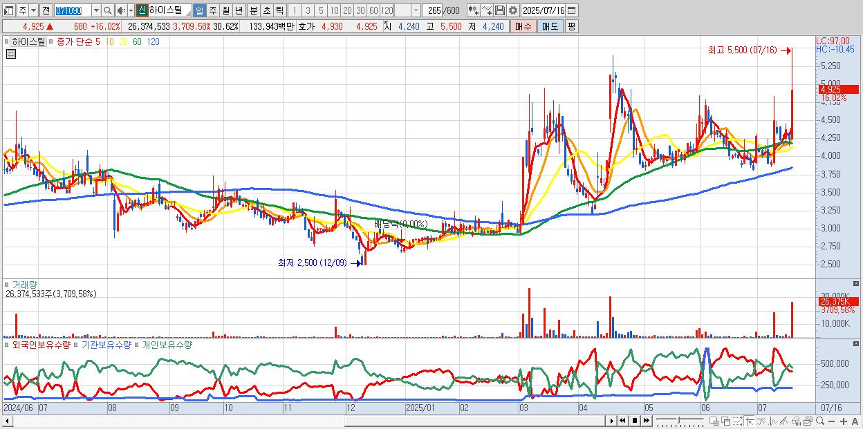 - 하이스틸 (4,925원 ▲ 16.02% , 시총: 994억, 거래량: 26,374,533, 거래대금:1,339억)