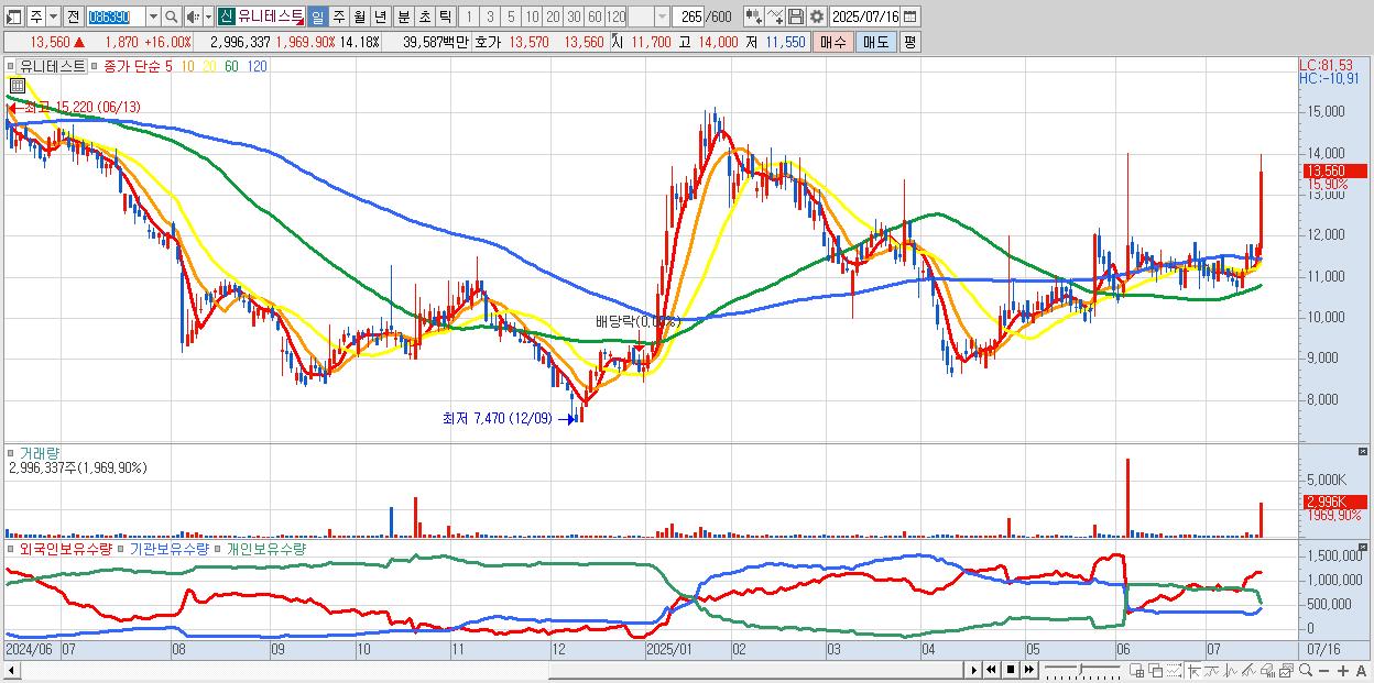 - 유니테스트 (13,090원 ▲ 11.98% , 시총: 2,766억, 거래량: 1,042,321, 거래대금:134억)