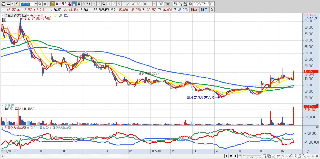 - 솔브레인홀딩스 (45,950원 ▲ 17.22% , 시총: 9,633억, 거래량: 697,628, 거래대금:311억)