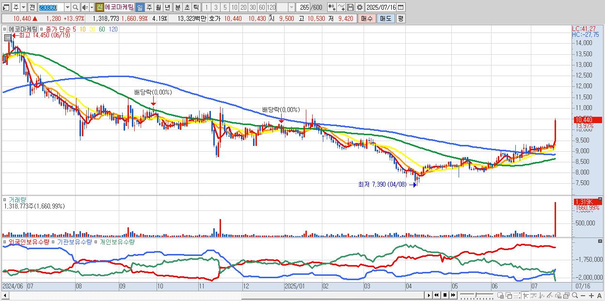 - 에코마케팅 (10,440원 ▲ 13.97% , 시총: 3,285억, 거래량: 1,318,773, 거래대금:133억)