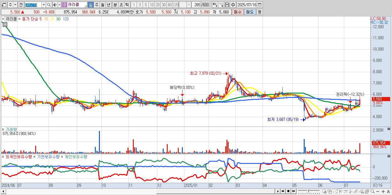 - 큐라클 (5,560원 ▲ 9.88% , 시총: 779억, 거래량: 875,954, 거래대금:49억)