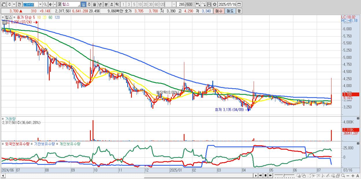 30.힘스 3,700원 ▲ 9.14% (KOSDAQ, 238490)