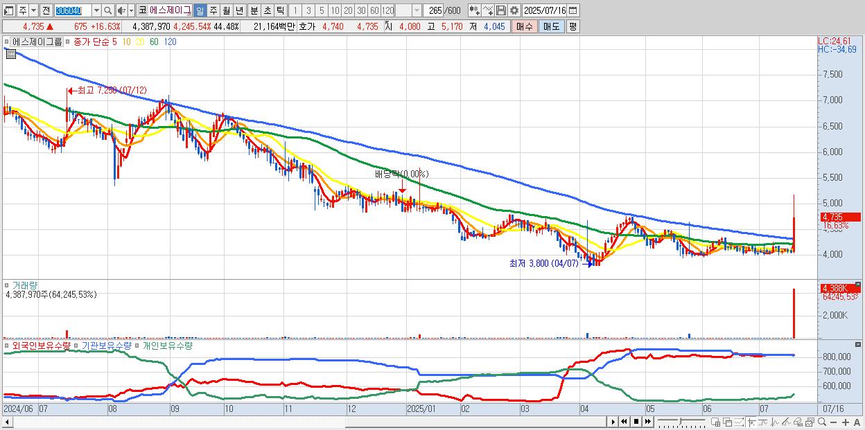 - 에스제이그룹 (4,735원 ▲ 16.63% , 시총: 467억, 거래량: 4,387,970, 거래대금:212억)