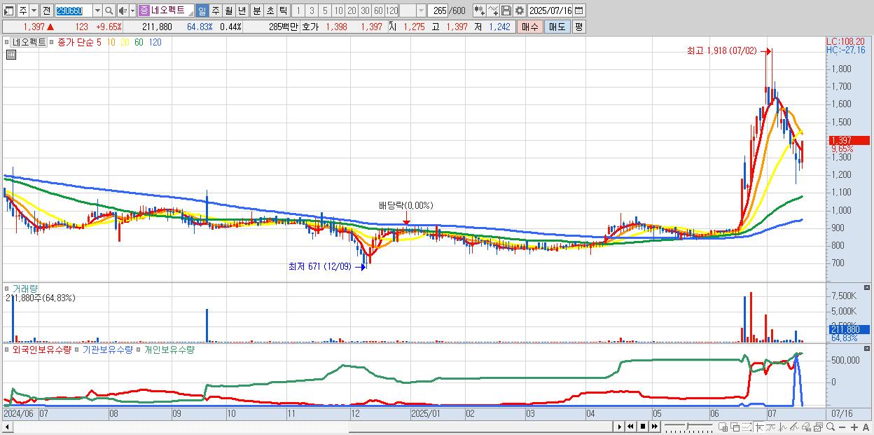 - 네오펙트 (1,397원 ▲ 9.65% , 시총: 676억, 거래량: 211,880, 거래대금:3억)