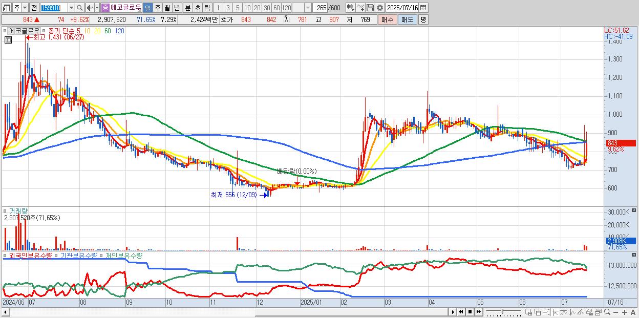 - 에코글로우 (843원 ▲ 9.62% , 시총: 336억, 거래량: 2,907,520, 거래대금:24억)