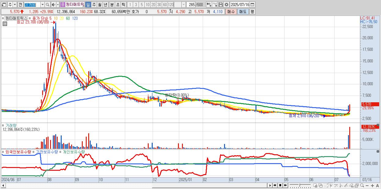- 퀀타매트릭스 (5,570원 ▲ 29.99% , 시총: 1,011억, 거래량: 12,396,864, 거래대금:607억)