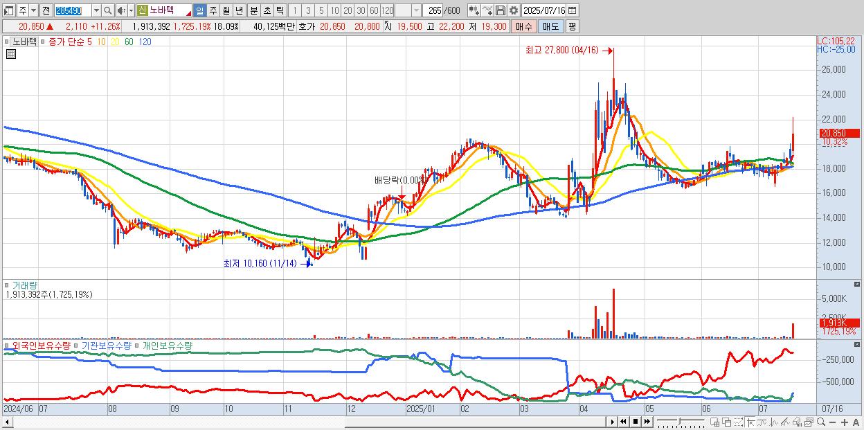 - 노바텍 (20,650원 ▲ 10.19% , 시총: 2,184억, 거래량: 679,148, 거래대금:141억)