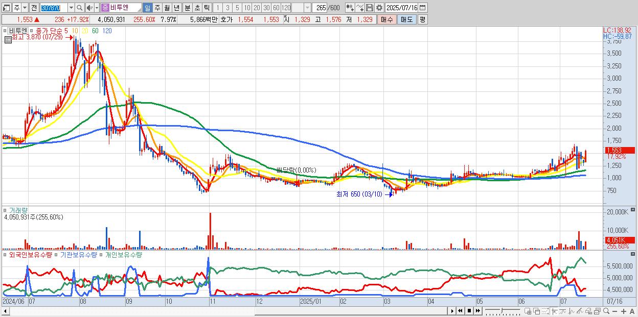 - 비투엔 (1,553원 ▲ 17.92% , 시총: 789억, 거래량: 4,050,931, 거래대금:59억)