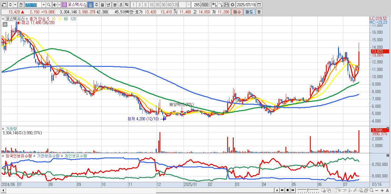 - 코스텍시스 (13,420원 ▲ 19.08% , 시총: 1,046억, 거래량: 3,304,146, 거래대금:455억)
