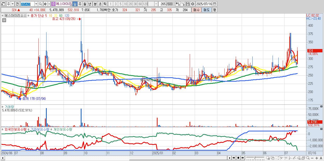 - 에스아이리소스 (324원 ▲ 14.08% , 시총: 232억, 거래량: 5,478,889, 거래대금:17억)
