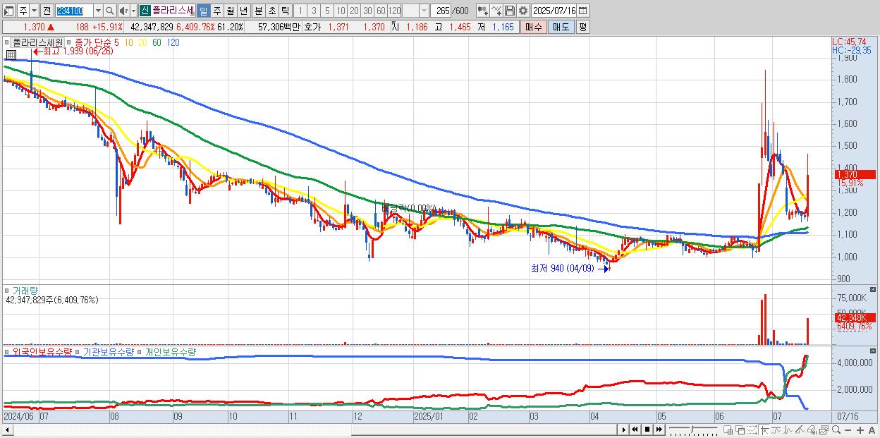 - 폴라리스세원 (1,370원 ▲ 15.91% , 시총: 948억, 거래량: 42,347,829, 거래대금:573억)