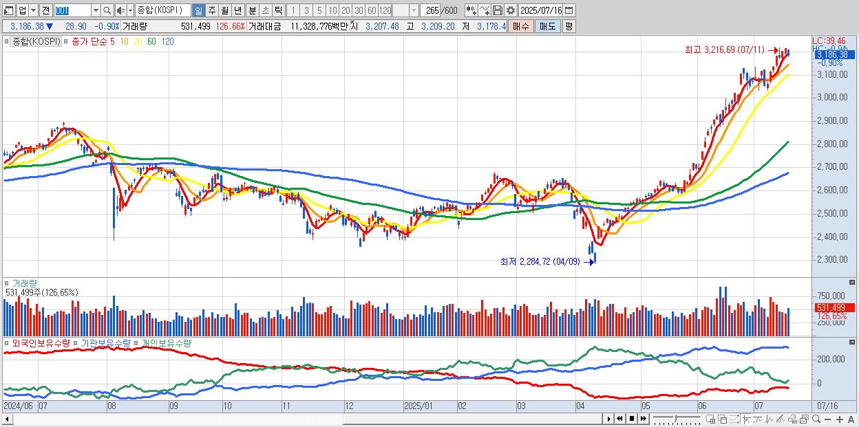 | 07/15 | 3,215.28 | ▲0.41% | -3,102억 | 2,123억 | -167억 | 1,146억 |