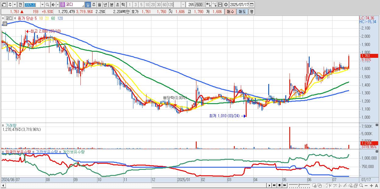 - 코디 (1,761원 ▲ 9.93% , 시총: 978억, 거래량: 1,270,479, 거래대금:22억)