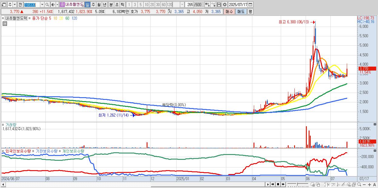 - 내츄럴엔도텍 (3,770원 ▲ 11.54% , 시총: 1,197억, 거래량: 1,617,432, 거래대금:62억)