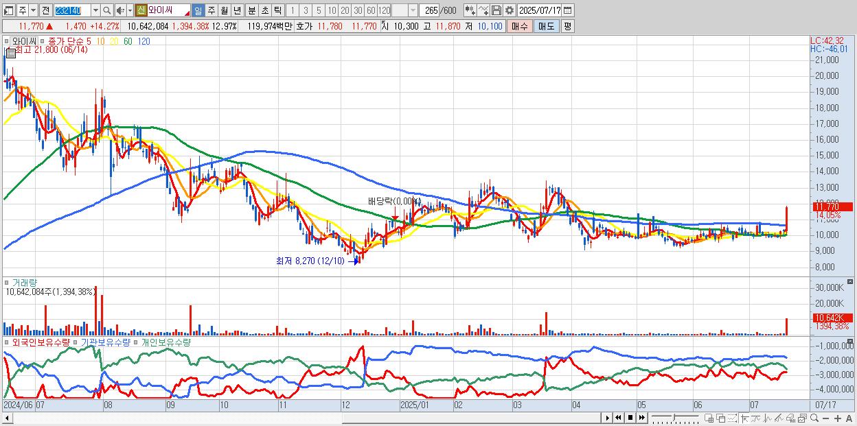 - 와이씨 (11,690원 ▲ 13.5% , 시총: 9,591억, 거래량: 5,279,848, 거래대금:592억)