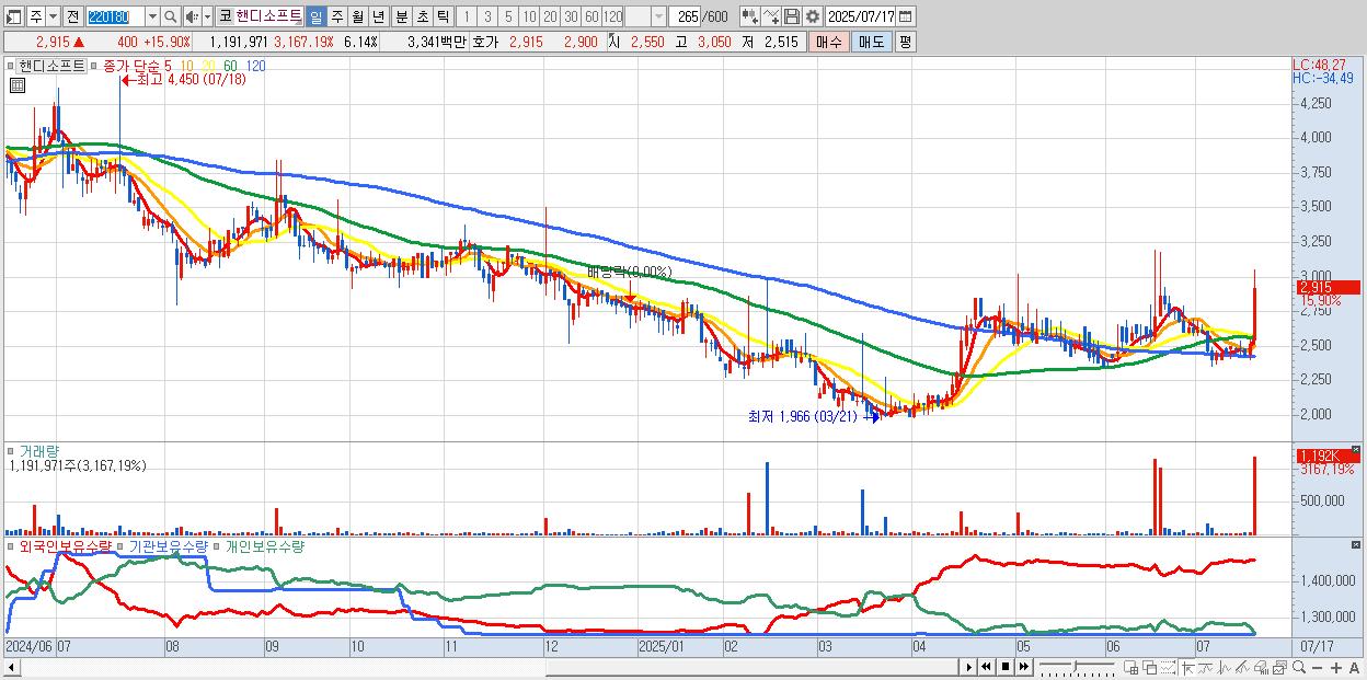 - 핸디소프트 (2,915원 ▲ 15.9% , 시총: 566억, 거래량: 1,191,971, 거래대금:33억)