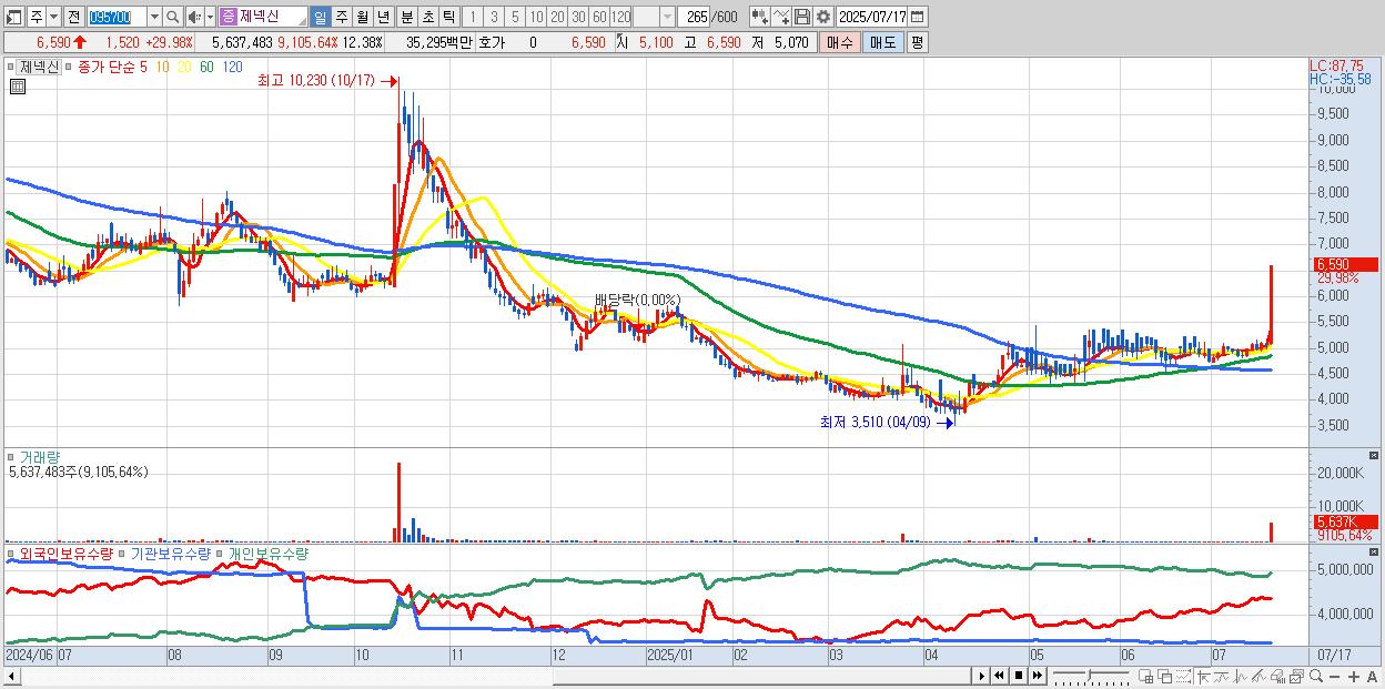 - 제넥신 (6,590원 ▲ 29.98% , 시총: 3,001억, 거래량: 5,637,483, 거래대금:353억)