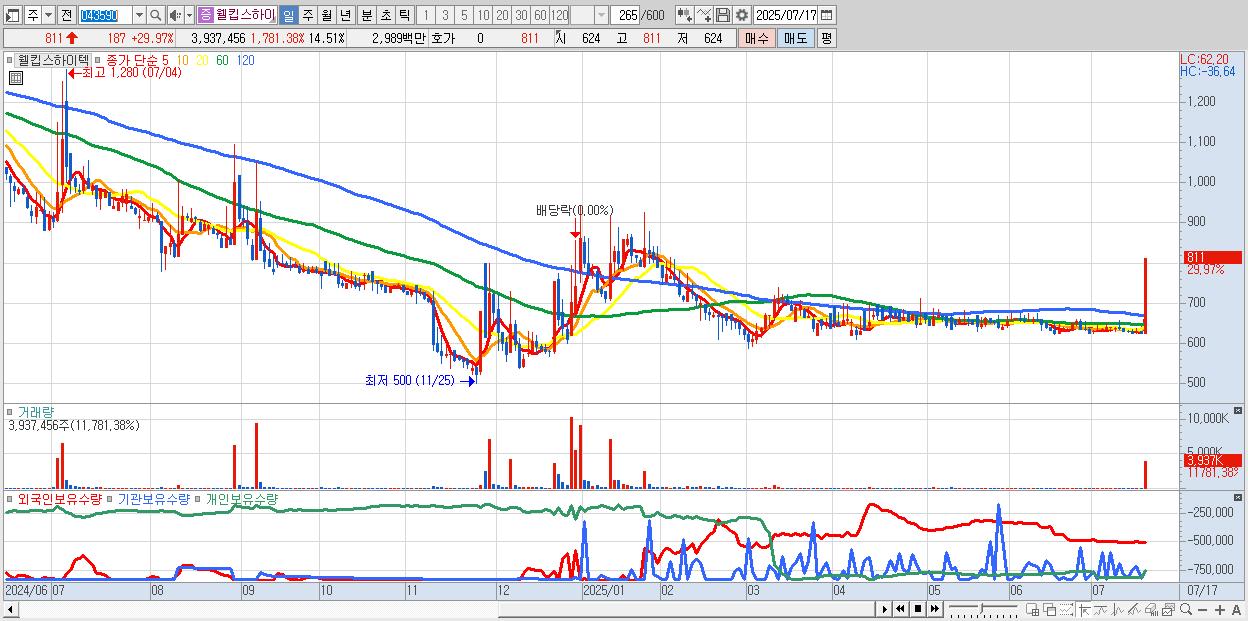 - 웰킵스하이텍 (811원 ▲ 29.97% , 시총: 220억, 거래량: 3,937,456, 거래대금:30억)