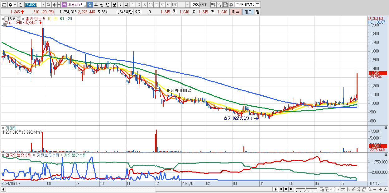 - 네오리진 (1,345원 ▲ 29.95% , 시총: 288억, 거래량: 1,254,318, 거래대금:16억)