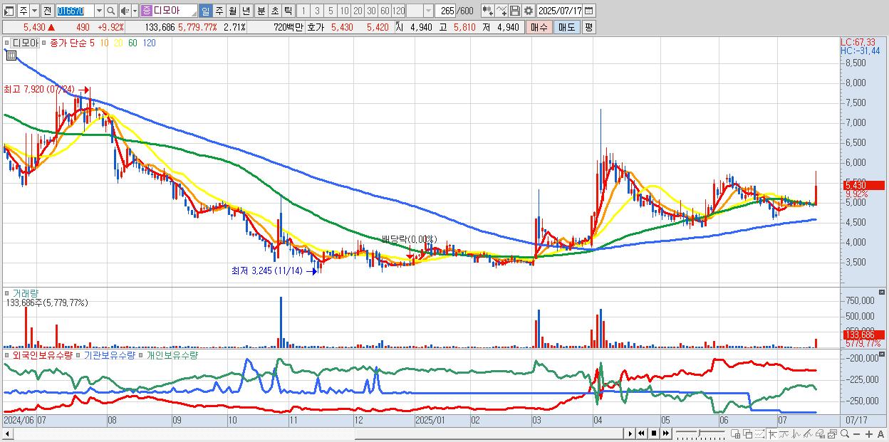 - 디모아 (5,430원 ▲ 9.92% , 시총: 268억, 거래량: 133,686, 거래대금:7억)